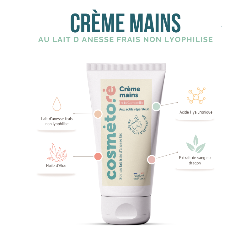 Pour des mains parfaites, lave-les avec notre savon surgras au lait d'ânesse (qui n'assèche pas) avant d'appliquer la crème.